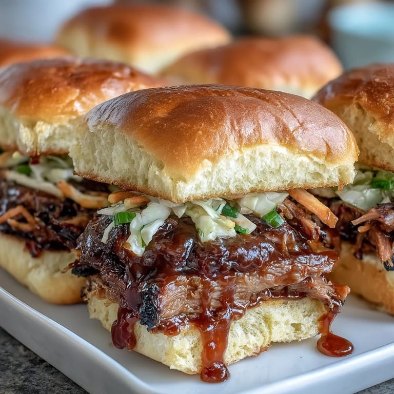 This recipe celebrates the art of low-and-slow cooking, transforming a simple beef brisket into party-ready perfection. The spice rub—featuring smoked paprika, brown sugar, and warm aromatics—creates a caramelized crust that locks in moisture during the long roasting process. As the brisket braises gently in beef broth, it becomes so tender you can pull it apart with just a fork. The homemade slaw adds a crucial bright, crunchy contrast that cuts through the richness, while toasted slider buns provide the perfect vessel for these incredible flavors.