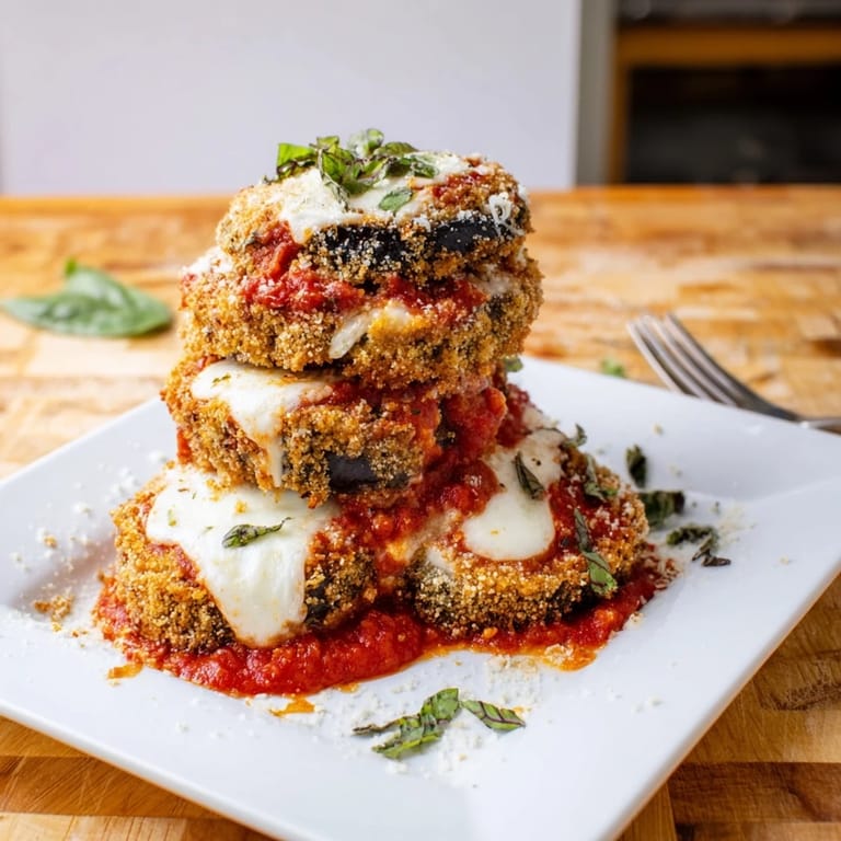 Save Dive into the heart of Italian comfort food with this classic Eggplant Parmesan. Layers of crispy, breaded eggplant, rich marinara sauce, and melted mozzarella and Parmesan cheeses come together in a symphony of flavor and texture. This vegetarian main dish is a true crowd-pleaser, baked to bubbly, golden-brown perfection and perfect for a satisfying family dinner.