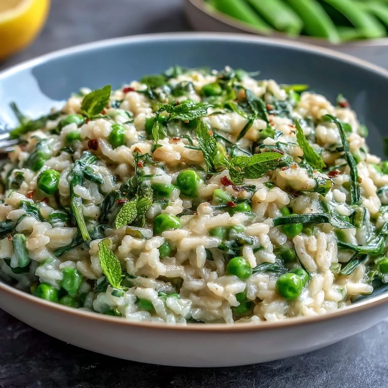 Save Celebrate the freshness of spring with this vibrant pea and mint risotto, a creamy Italian classic elevated by the bright flavors of tender green peas and fragrant mint. Finished with rich Parmesan cheese and a hint of zesty lemon, this dish is perfect for impressing guests at your seasonal dinner party. Its comforting texture combined with fresh ingredients makes it an elegant yet approachable main course that captures the essence of the season.
